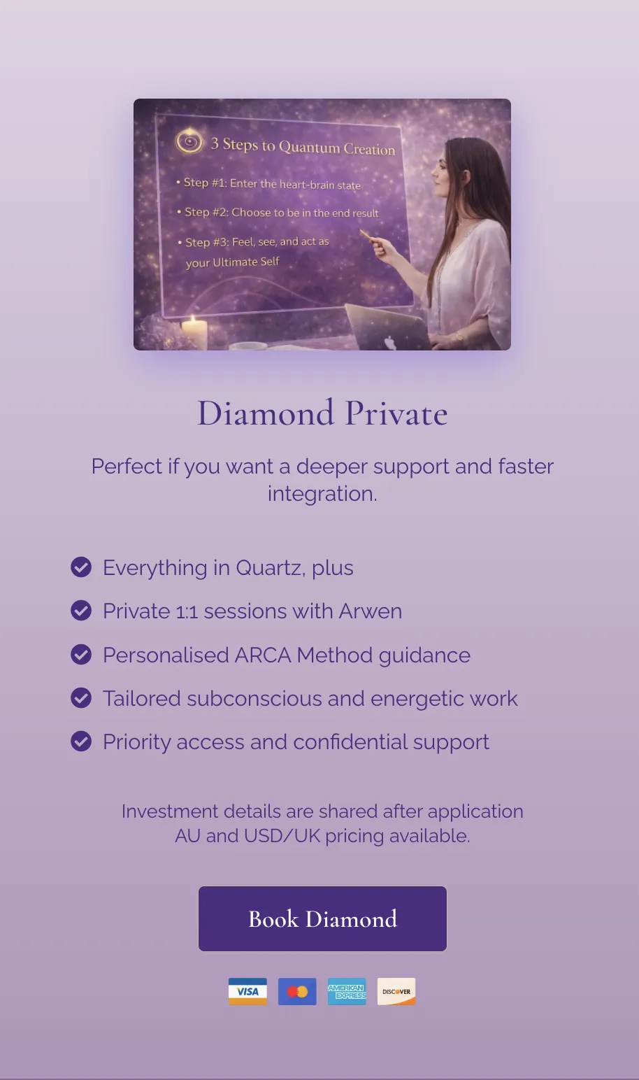 Diamond Private includes everything within Quartz Collective, with the addition of private one-to-one sessions with Arwen.