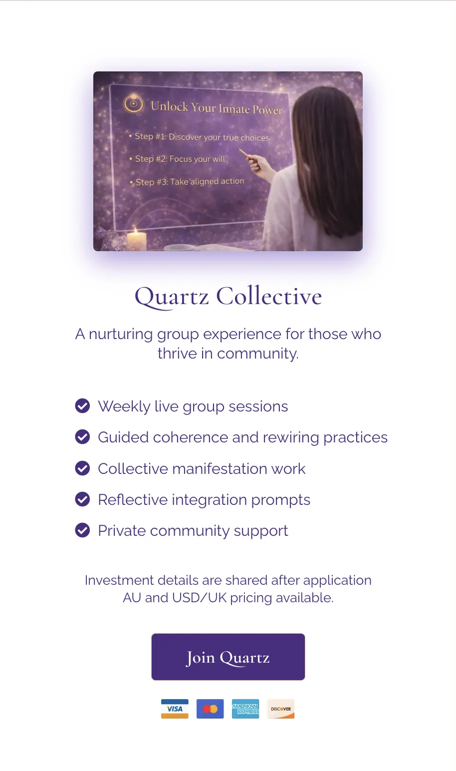 Quartz Collective is a supportive group journey for those who value shared energy, structured guidance, and steady integration.
